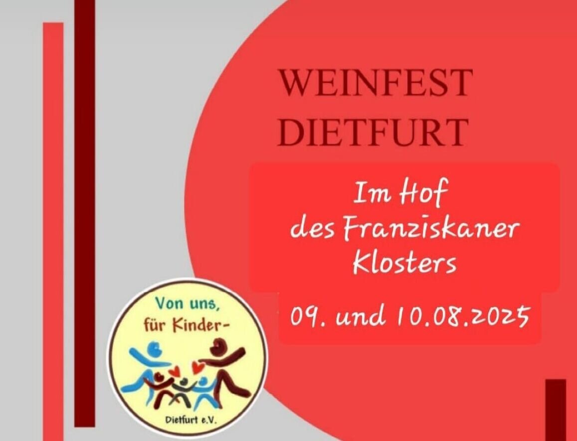 Der Verein Von Uns, für Kinder - Dietfurt e.V. lädt zum Weinfest im Klosterhof - Der Erlös wieder wieder gespendet. Musikalische Umrahmung durch Dietfurter Musikanten und Sänger. Samstag ab 19 Uhr mit Brotzeiten, Sonntag ab 15 Uhr mit Kaffee, Kuchen, Brotzeiten ...