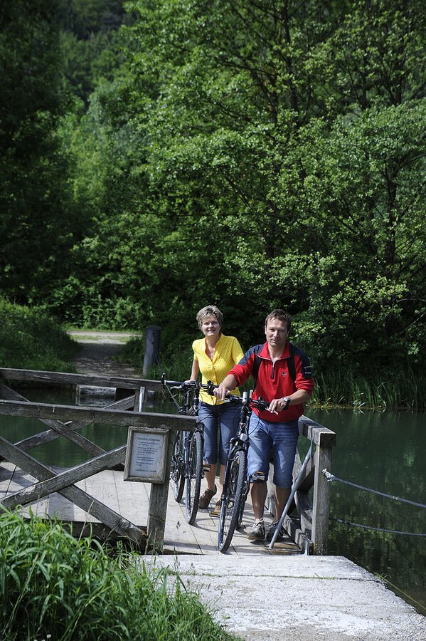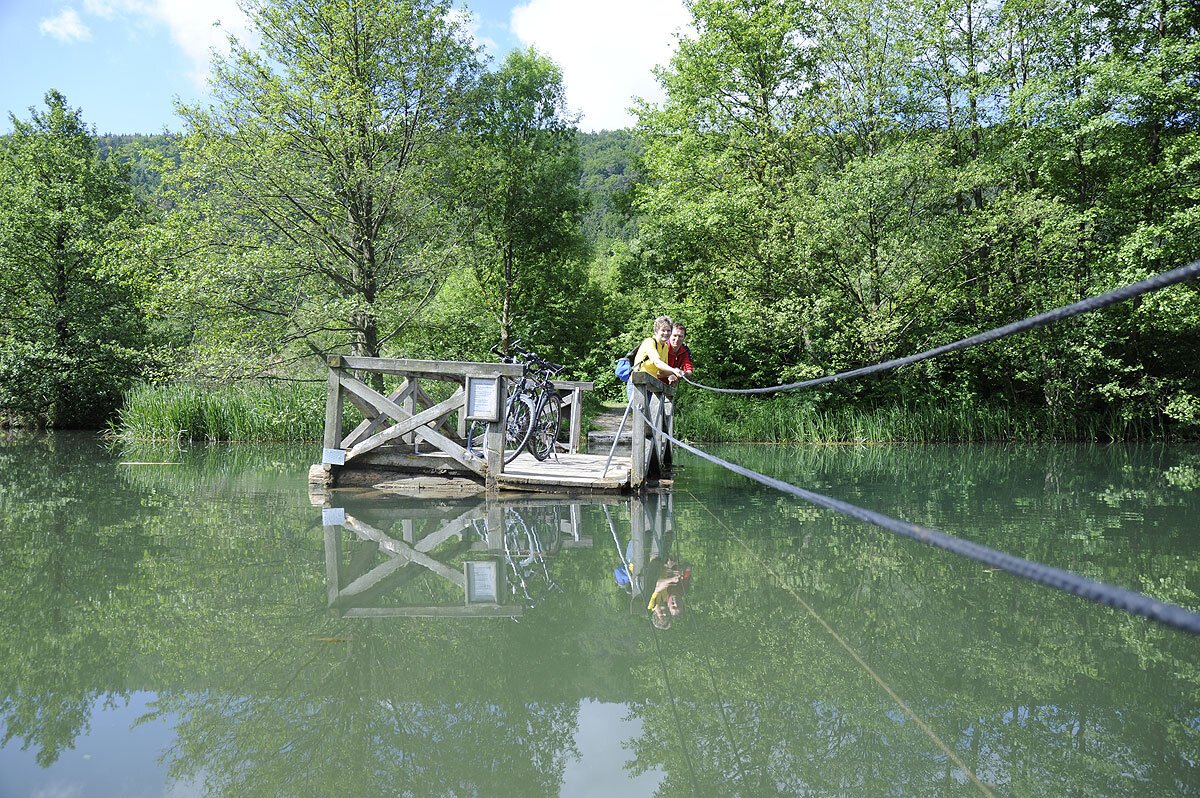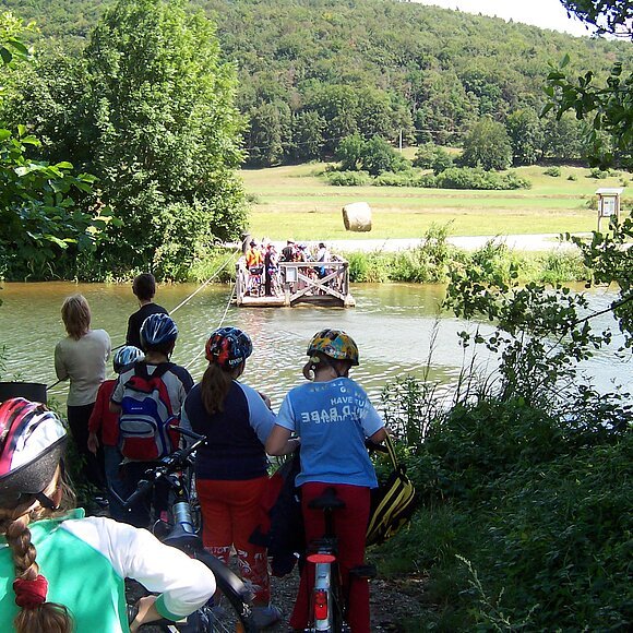 Das Floß an den Dietfurter Wasserwegen W3 und R1 ist eine sehr beliebte Möglichkeit für Radfahrer und Wanderer zur Überquerung des ehemaligen Ludwig-Donau-Main-Kanals. Es lädt auch zum Verweilen und Genießen der Natur auf dem Wasser ein.