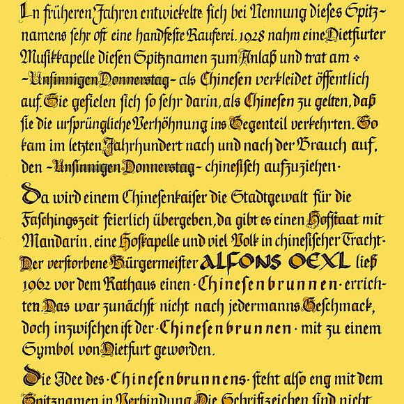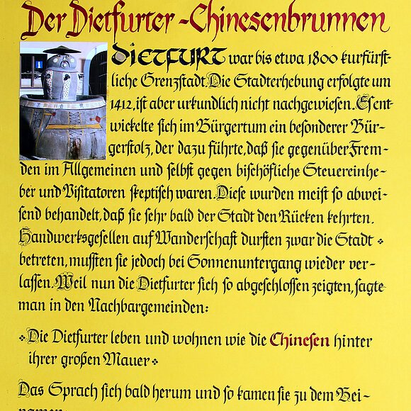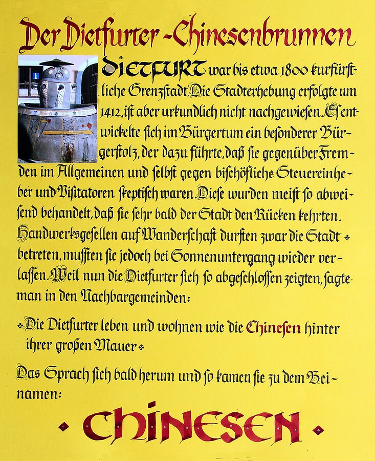 Der 1962 erbaute Chinesenbrunnen vor dem Rathaus (ein frühes Werk von Lothar Fischer) weist darauf hin, dass sich die Dietfurter mit dem Spitznamen "Chinesen" nicht nur längst abgefunden haben, sondern auf ihn stolz sind.