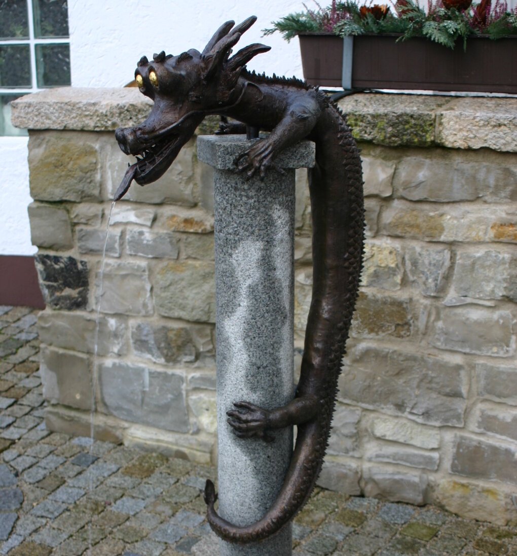 Der Drachenbrunnen steht in der 7-Täler-Stadt neben dem Hollerturm, einem Wehrturm der im Jahr 1444 gebauten Stadtbefestigung.