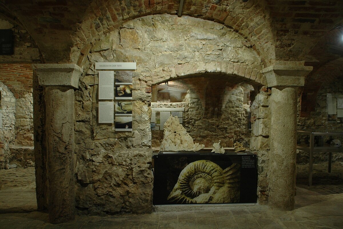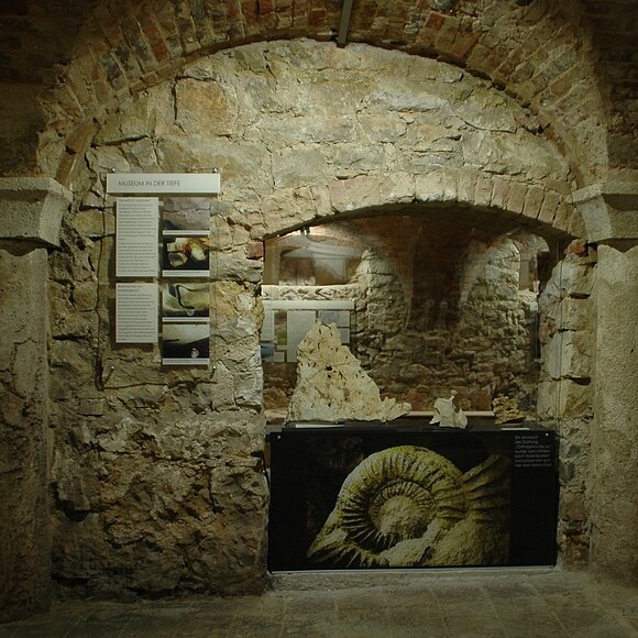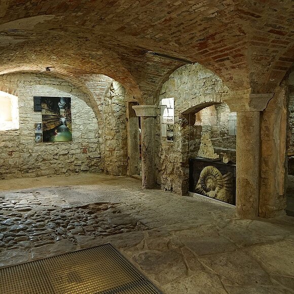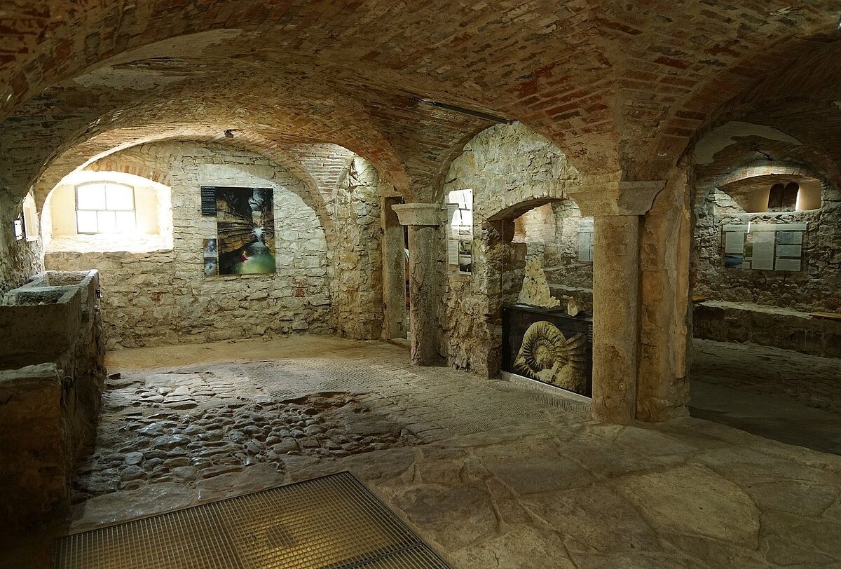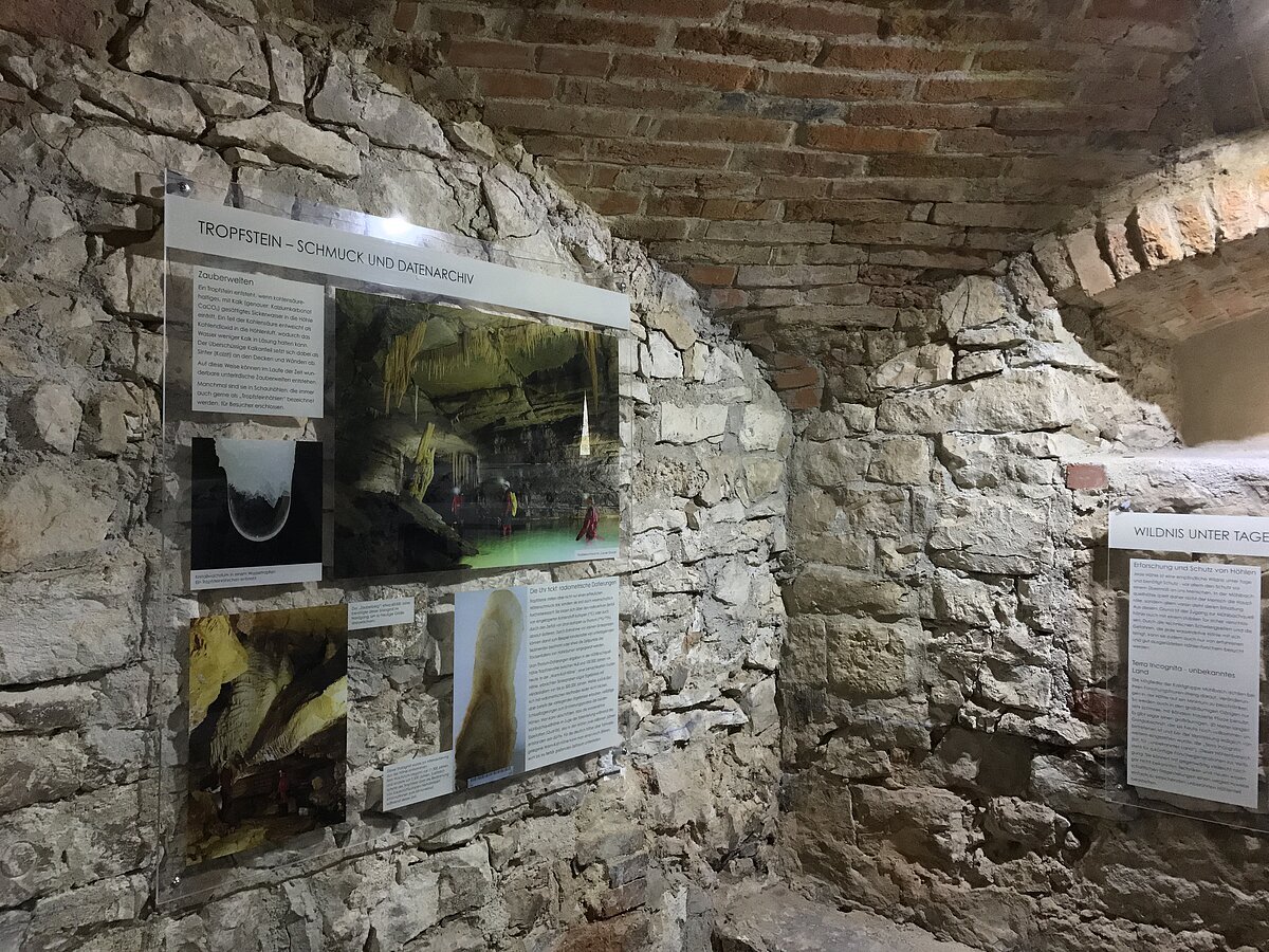In den beiden Gewölberäumen im Erdgeschoß des Steinstadels, ehemalige Stallräume, präsentieren die Höhlenforscher der Karstgruppe Mühlbach e.V. ihre Forschungsergebnisse aus der Mühlbachquellhöhle, die ihren Ausfluss auf dem Mühlengrundstück hat. Unter dem mittleren Raum fließt sichtbar der Triebwerkskanal durch und stellt damit die Verbindung zur Mühlbachquellhöhle her.