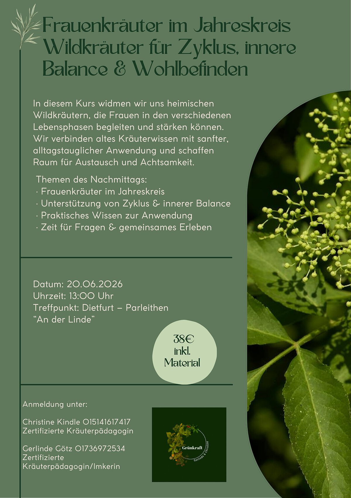 In diesem Kurs widmen wir (Christine Kindle und Gerlinde Götz) uns mit euch den heimischen Wildkräutern, die Frauen in den verschiedenen Lebensphasen begleiten und stärken können. Wir verbinden altes Kräuterwissen mit sanfter, alltagstauglicher Anwendung und schaffen Raum für Austausch und Achtsamkeit.