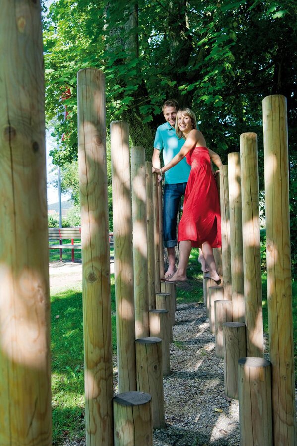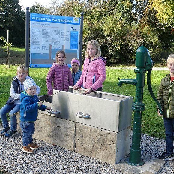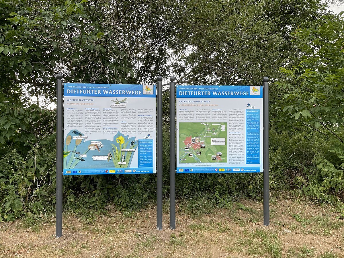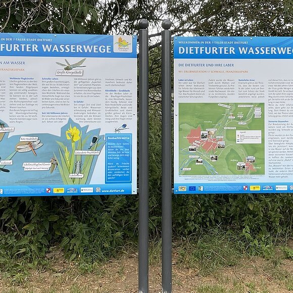 Der Weg "Stadt & Wasser" führt entlang der Stadtlaber über die Dolung zum Laberweiher und zum Franziskuspark. Drei neue Erlebnisstationen für Kinder und sechs Infotafeln befinden sich an der Strecke. Außerdem liegen direkt am Wanderweg W1 auch der Barfußpark und die Kneippanlage.