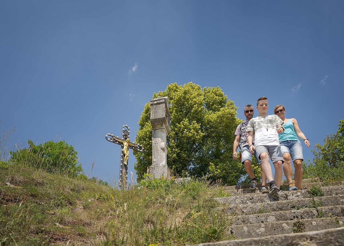 Beide Touren beginnen am Chinesenbrunnen vor dem Rathaus. Zunächst geht man Richtung Kreuzberg, über einen artenreichen sonnigen Trockenrasen erreicht man bald den Aussichtspunkt am Kreuzberg mit einem überwältigenden Blick auf Dietfurt und das weite Becken der 7-Täler-Stadt. Richtung Norden geht es weiter an alten Hecken, Obstbäumen und blühenden Waldrändern entlang. Auf einer ins Tal der Weißen Laber vorspringenden Felsnase trifft man auf die Ruine Ödenburg und den Sprüchewald. Die Dörfer Hainsberg und Mitteldorf umrundend führt der Weg weiter am Waldrand entlang über die Hochfläche. Auf dem sogenannten Ochsensteig gelangt man hinunter ins Tal der Weißen Laber.